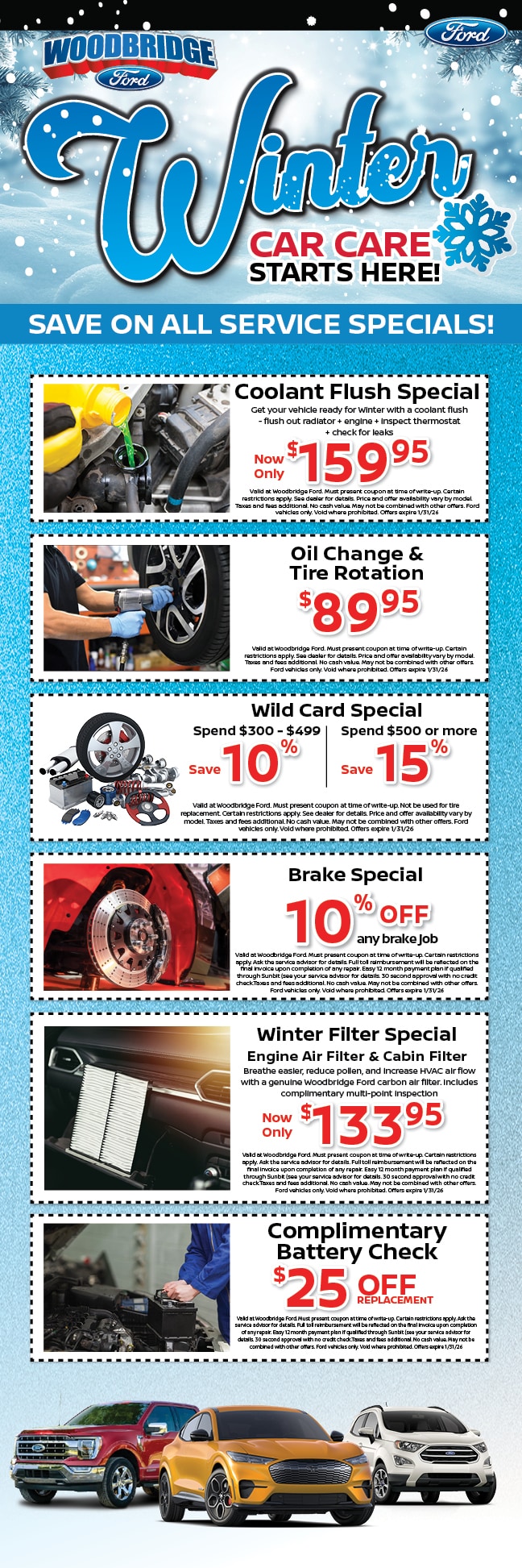 Expires January 31, 2026. Limit one coupon per customer. Coupon cannot be combined with other discounts, incentives, or internet pricing. Certain vehicle exclusions apply, see dealer. Cannot be applied towards prior purchases. Must print and present coupon prior to write up in order to qualify.